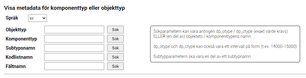För att söka efter en objekttyp anger du objekttypsnumret, ett intervall av nummer eller objektets namn i fältet och trycker Sök. På samma sätt kan du visa metadata för Komponenttyp, Subtypsnamn, Kodlistnamn och Fältnamn.