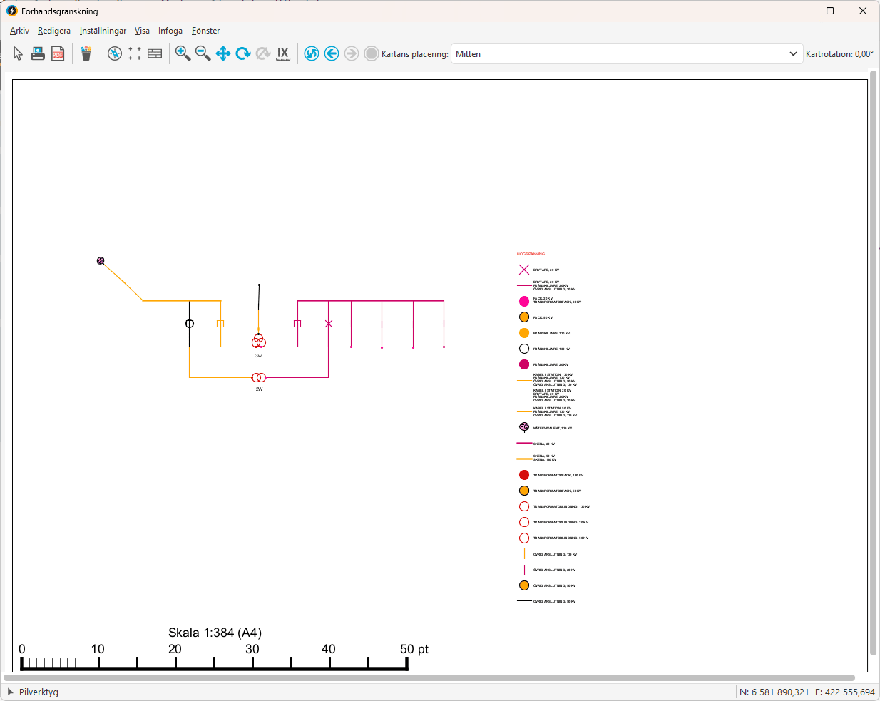 Informationen som finns i teckenförklaringen blir inte synlig i ritningsramen förens denna placeras i vektyget Fri plottning. I ritningsramen kommer teckenförklaringen endast att se ut som ett kvadratiskt/rektangulärt objekt.