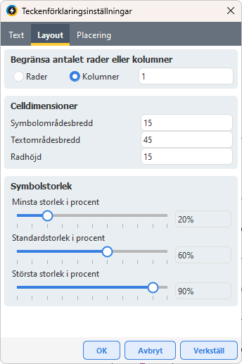 Layout - Styr utseendet för tabeller via antal rader/kolumner, celldimensioner, symbolstorlek.