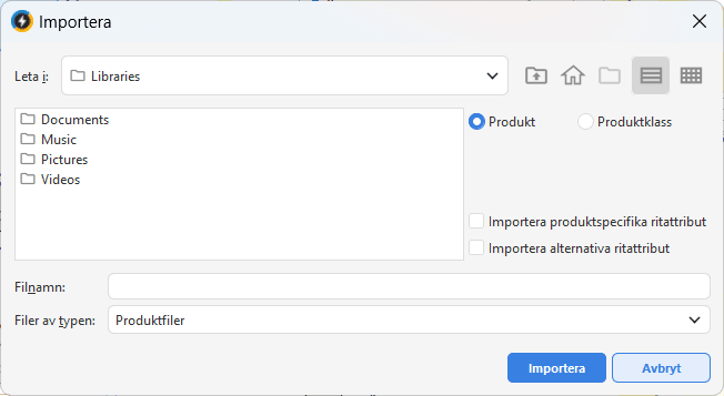 2.Välj den fil du vill importera och ange om den innehåller produkt eller produktklass. Om du importerar produkter kan du även välja att inkludera produktspecifika ritattribut och/eller alternativa ritattribut.