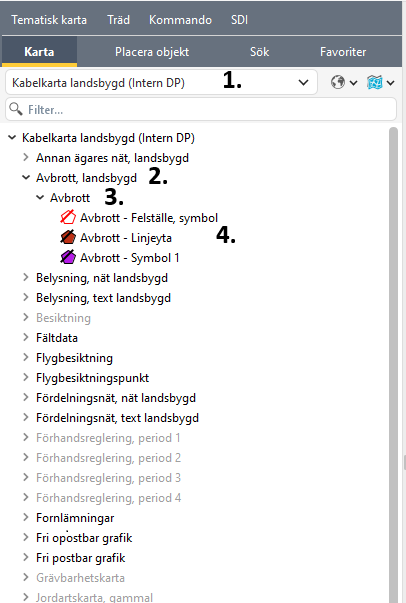 Alternativen för att styra vilken kartdata som ska ritas ut, når du genom att högerklicka på enskilda eller en grupp produktklasser, objekttyper eller grafiska komponenttyper i sidofältet, flik Karta. Du har även möjlighet att ändra produkt i rullgardinsmenyn. För att markera fler objekt i trädvyn, använd Ctrl eller Shift.