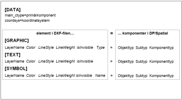 Exempel: Ett DXF-lager för kulvert kan mappas antingen som en symbolkomponent eller en grafisk komponent. Om lagret mappas i både SYMBOL- och GRAPHIC-sektionerna skapas två separata kulvertobjekt vid importen, även om det i DXF-filen var ett enda objekt.