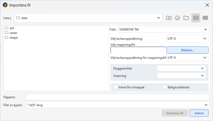 När du skapar eller importerar DXF/DWG-filer kan du behöva välja teckenkodning för både datafilen och mappningsfilen. Detta görs i respektive dialogruta.