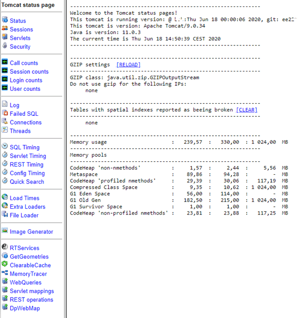 Tryck på Save status as zip för att spara all aktuell statusinformation som en zip-fil. Denna fil kan sedan användas för felsökning, exempelvis om Tomcat behöver startas om och du vill behålla logg- och statusinformation för senare analys.
