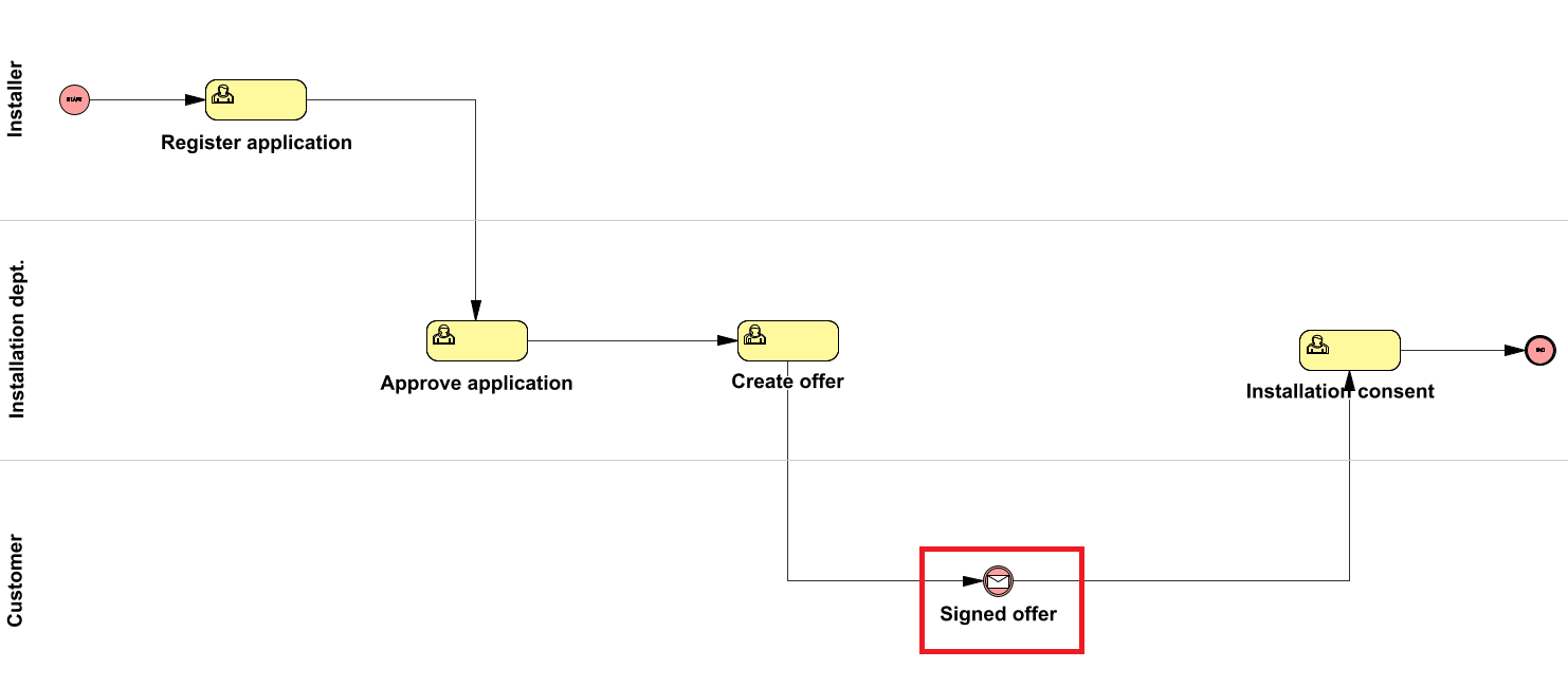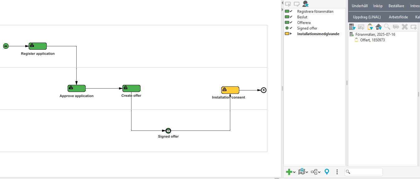 Samma process visualiserad i Organizer efter mappning till uppdragsmall. Uppgifterna Registrera föranmälan, Beslut och Offerera har genomförts och avslutats manuellt. I Offerera skickades en offert för signering via Scrive. När kunden signerade dokumentet, triggades den mellanliggande händelsen med meddelande-ID DP_DOCUMENT_SIGNED automatiskt, vilket gjorde att processen fortsatte till Installationsmedgivande.
